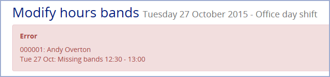 Under certain circumstances it will not be possible for you to modify your Hour bands and an error message will be displayed. These are often caused by restrictions which are defined by your system administrator or they may fail for a variety of reasons such as forgetting to complete mandatory fields. The following are examples of errors and warning messages you may see.