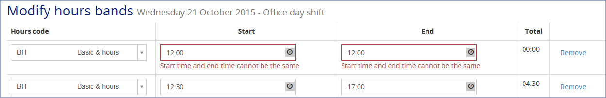 If you attempt to add or modify an Hours band with the same Start and End time, you will see the following error message: