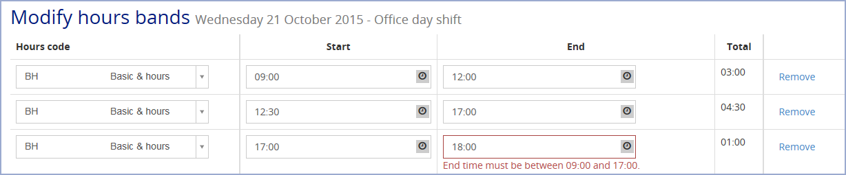 If you attempt to add or modify an Hours band outside the range of your shift, you will see the following error message: