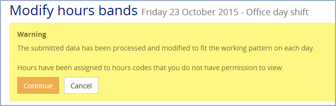 When saving or submitting your modified Hour bands, you may be sent to a new page with a warning message. The message warns you that TMS has modified the Hours bands information you have inputted to fit the set working pattern of the day. For example: