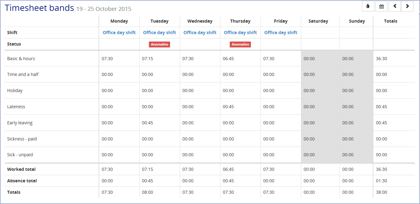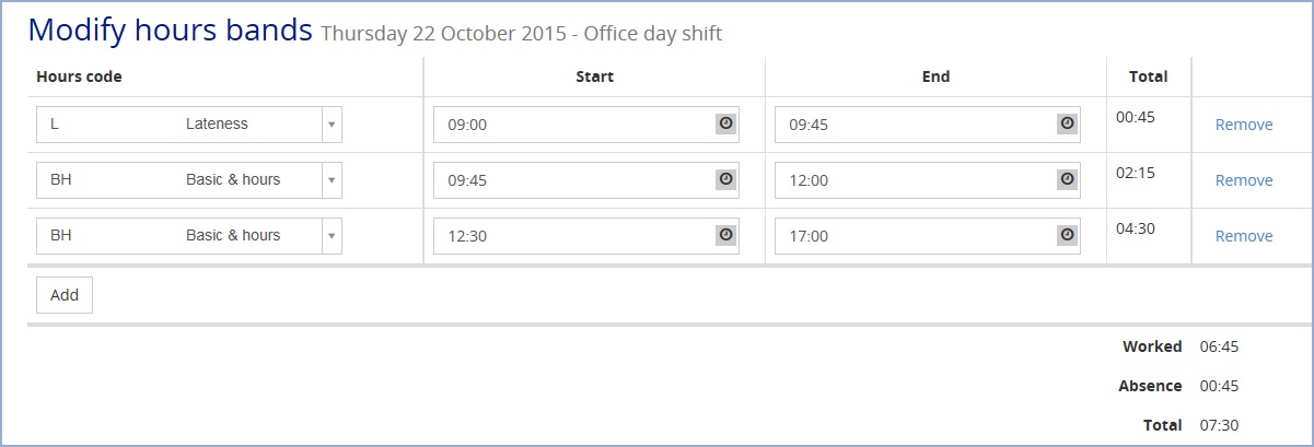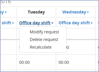 Note: if you have permission, additional options may be available for the Shift and a drop-down menu will appear instead when clicking on the shift name. Click 'Modify' to open the Modify hours bands page or click 'Recalculate' to re-calculate the Worked and Absence hours based on the core hours of the Shift you worked that day
