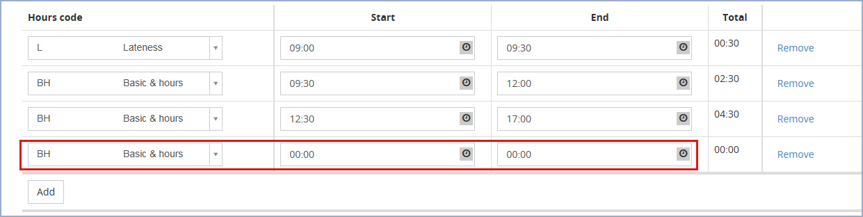 Add an Hours band by clicking on the Add button at the bottom left of the grid. This will add an extra Hours band row with empty boxes to input the Hours code, Start and End time. For example: