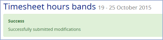 Note: the 'Save as draft' option is a Preference set by your system administrator so it may not be available on your system.When you have finished, click Submit in the left-hand pane to save your modified Hour bands and return to the Timesheet bands page. The new hours are added to the relevant day and a success message will appear at the top of the page. For example: