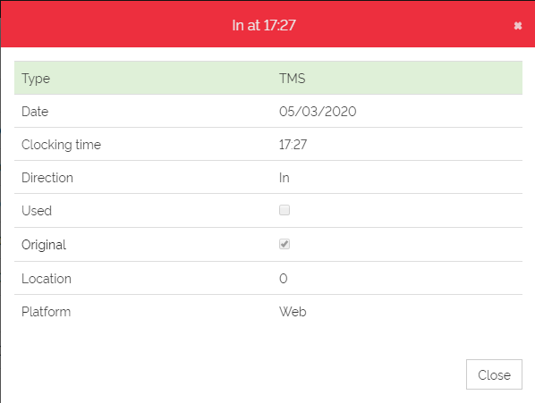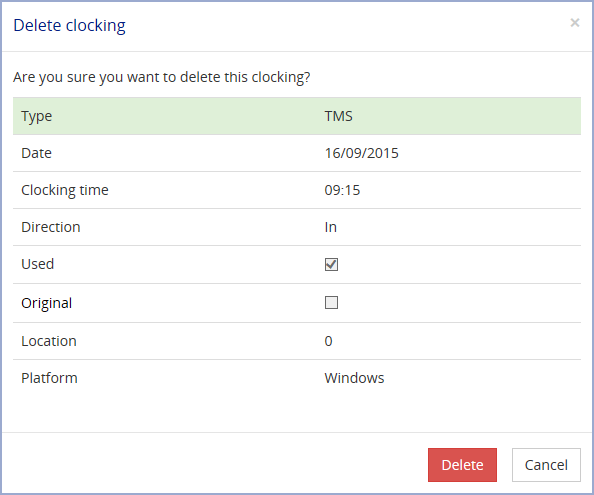 The previous example shows the details for a TMS clocking made on '16/09/2015' at '09:15'. The Clocking Type is highlighted with a coloured background; green in this instance for a TMS 'In' Clocking. No location is recorded for the Clocking.