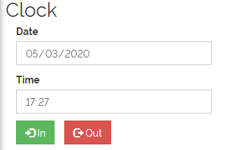 Depending on how you system administrator has setup your system, selecting Clock in or Clock out from the TMS menu, or the Clock in or Clock out shortcut, will automatically make the appropriate clocking and a success message will appear on the top of your dashboard to confirm the clocking. Or, if your system has been setup differently, clicking Clock in or Clock out opens the Clock in or Clock out page: