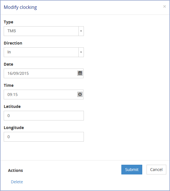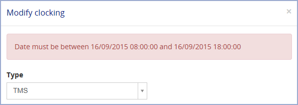 Note: if you attempt to change the Date or Time of a clocking where the changes would fall outside the start and end times recorded for the Shift in TMS, a warning is displayed when you click Submit . For example:To apply the changes, click Submit in the left-hand navigation pane or click Cancel to discard the modification and return to your Clock card.