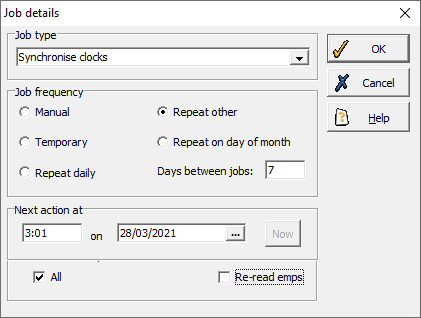 Note: If you already have a ‘Synchronise Clocks’ job at 3:00 or 3:01 which runs on Sunday (daily or weekly) then ignore the remaining steps and select Close and Exit. - To add a job, click on the New button and select the job type to Synchronise clocks. Set the Job frequency to Repeat other and enter 7 within Days between jobs. Alternatively, the Job frequency can be set to Temporary, however this method will not synchronise automatically for future time changes.