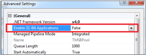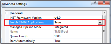 To do this, simply load Internet Information Service (IIS) Manager and expand the Application Pool. Then, right click on the application pool used by TMS and select Properties, then click Advanced settings.