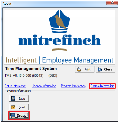 Load WinTMS as the MASTER user and select the menu Help > About. Select on the ‘System Information’ link, then select ‘Backup’ button and enter the daily pin provided by Mitrefinch Support.