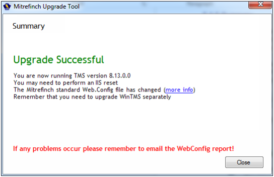 A WebConfig report is also produced by the Upgrade tool, and is saved on the desktop of the PC where the upgrade was performed. If you are having any difficulties, please email this file to support@mitrefinch.co.uk