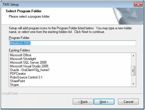 Select a folder from the programs menu on your PC where the new TMS icons will be stored: