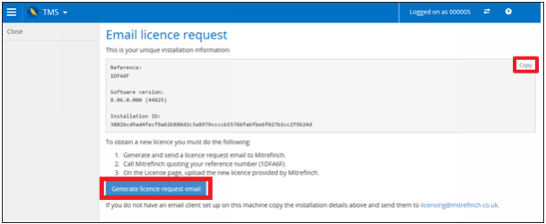 Select ‘Generate licence request’ email to open the draft message in your default email client. The generated email is addressed to Mitrefinch and contains your unique installation information in the message. Once you have sent the message, contact Mitrefinch by telephoning 0330 726 0090 and quote your reference number displayed in the email.