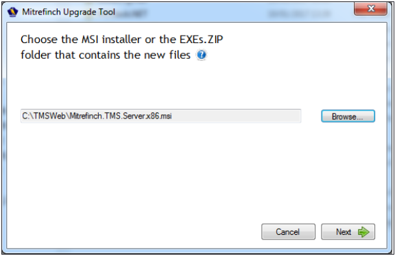The Upgrade Wizard will prompt you to choose the MSI installer to launch the Mitrefinch Upgrade Tool. To do this, select the Browse button, which will default to the location of your extracted files.