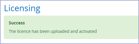 When activated, you'll be directed back to the Licensing page. A success message will be displayed at the top of the page along with all the updated details of the new licence. For example: