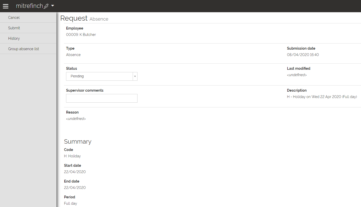 Further details of a Request are available from the Request list page by clicking on the Type or Description of a Request. An example below is more information about an Absence request: