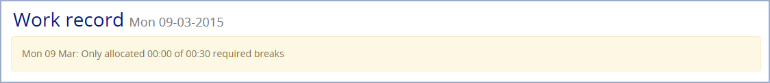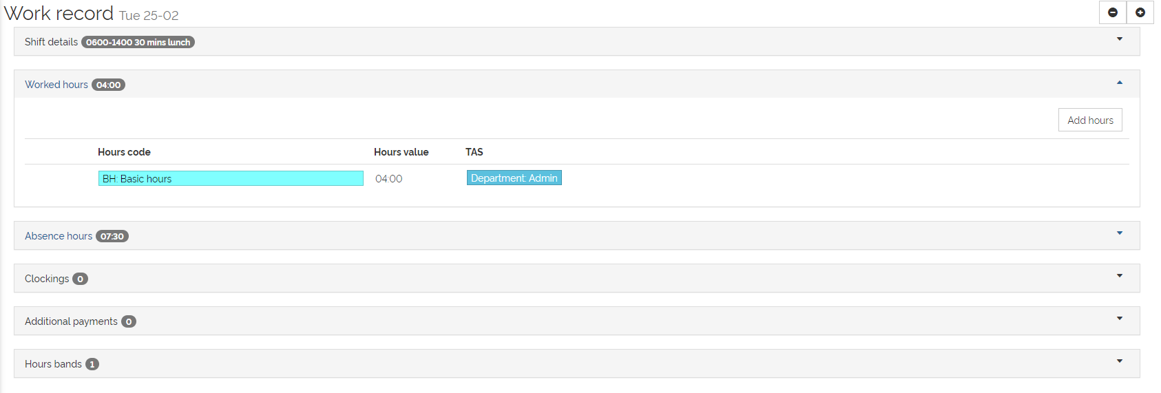 The following example shows the Edit work record page for an Employee on the 25th of February 2020. The Worked hours panel expanded: