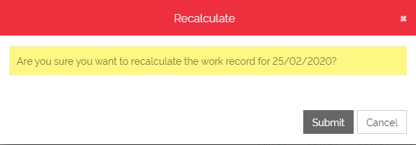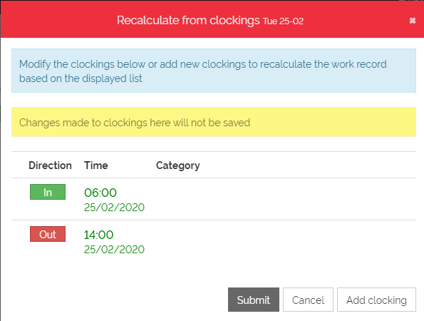 Note: any changes made to clockings will not be saved, they will only be used to recalculate the work record.