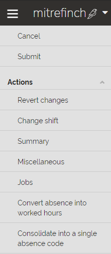 There are also a series of actions available from the left-hand navigation pane. These are: Submit, Cancel, Revert changes, Change shift, Summary, Miscellaneous, Rostered jobs, Convert absence into worked hours and Consolidate into a single absence code.