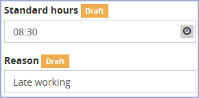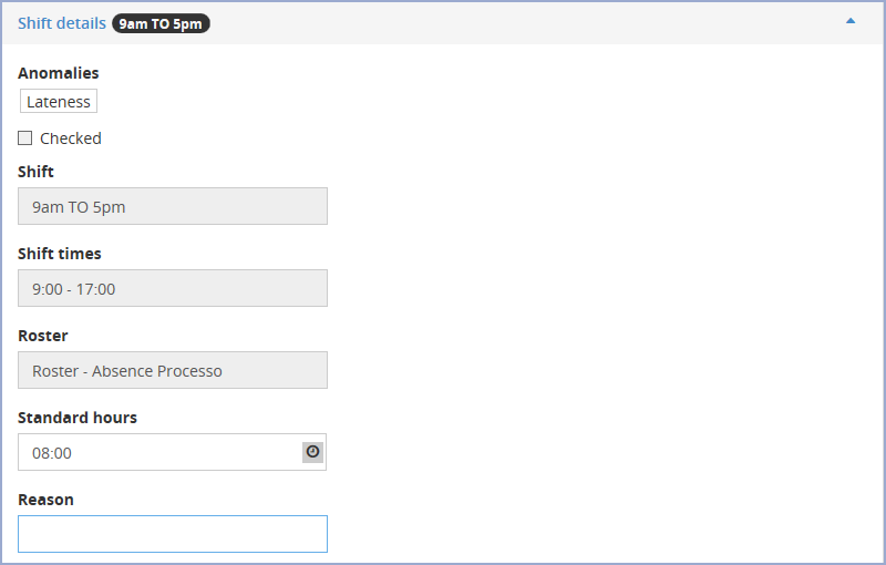 You may be able to edit the Shift details. In the previous example, only the Standard hours and Reason fields can be edited. Any fields you are not allowed to edit have a grey background; a prohibition symbol is displayed when you hover your cursor over these fields. In the example the Checked, Shift, Shift times and Roster fields cannot be edited.
